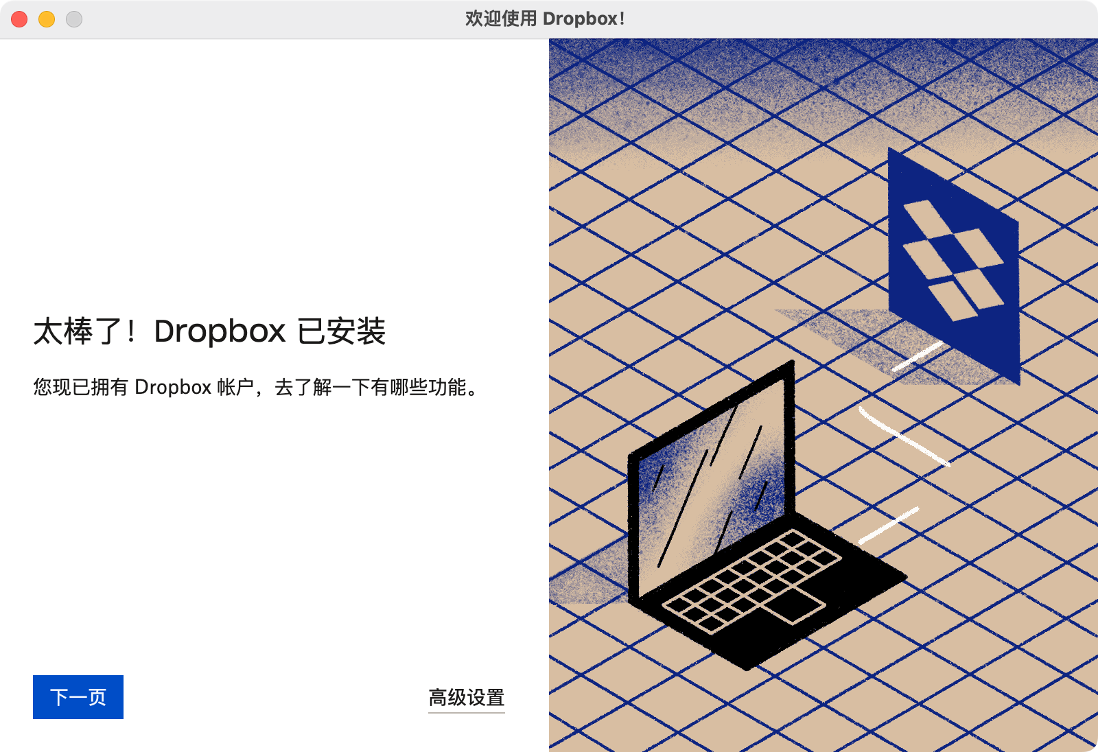 只有在这个时候你才能开始使用 Dropbox。要是我没有注册过账户的话,还会有另外的五个步骤。荒谬!